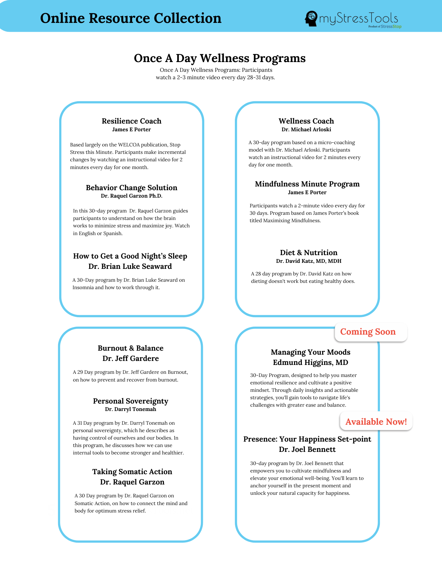 Dan Goleman, Ph.D., Joan Borysenko, Ph.D., David katz, M.D., Ann Kulz, M.D., Rubin Naiman, Ph.D., Michael Arloski, Ph.D., Heidi Hanna, Ph.D., Dr. Raquel Garzon, Dr. Brian Luke Seaward and Dr. Jeff Gardere and more.